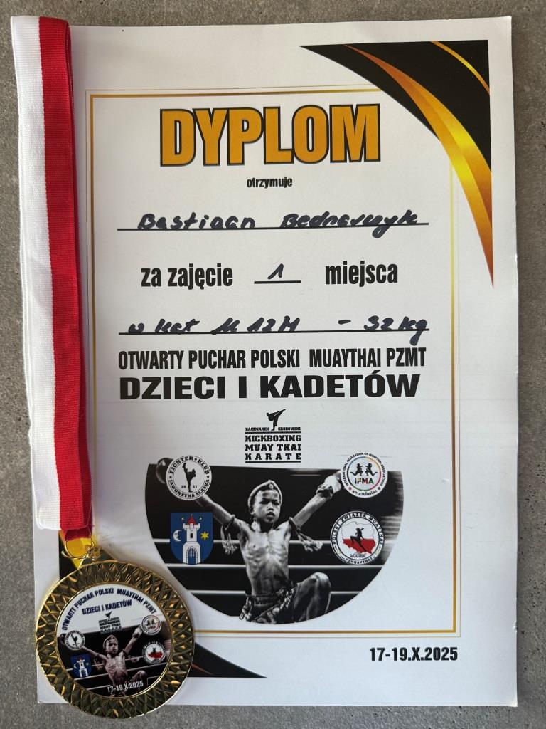 Od 17 do 19 października w Świebodzicach odbył się Otwarty Puchar Polski Muaythai dzieci i kadetów. W zawodach wzięli udział najlepsi zawodnicy z całego kraju jak również z zagranicy. Wśród nich mieszkaniec gminy Blizanów, uczeń klasy 5a Szkoły Podstawowej im. Mikołaja Kopernika w Piotrowie - Bastiaan Bednarczyk, reprezentujący kaliski klub KRUK Gym Kalisz. Zdobył złoty medal w kategorii -32 kg (U12), tym samym Puchar Polski Muaythai 2025. Aby to osiągnąć musiał stoczyć trzy emocjonujące walki. W całych zawodach klub KRUK Gym Kalisz zdobył łącznie aż 8 medali: 5 złotych, 2 srebrne i 1 brązowy, zajmując 2. miejsce drużynowe w klasyfikacji generalnej. „Nasz aktualny Mistrz Polski w swojej kategorii potwierdził tym samym, że jest już gotowy na Mistrzostwa Europy, które odbędą się w dniach 17-25 listopada w Atenach” – informuje jego tata Sebastian Bednarczyk.