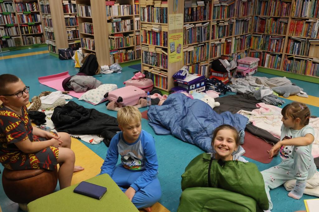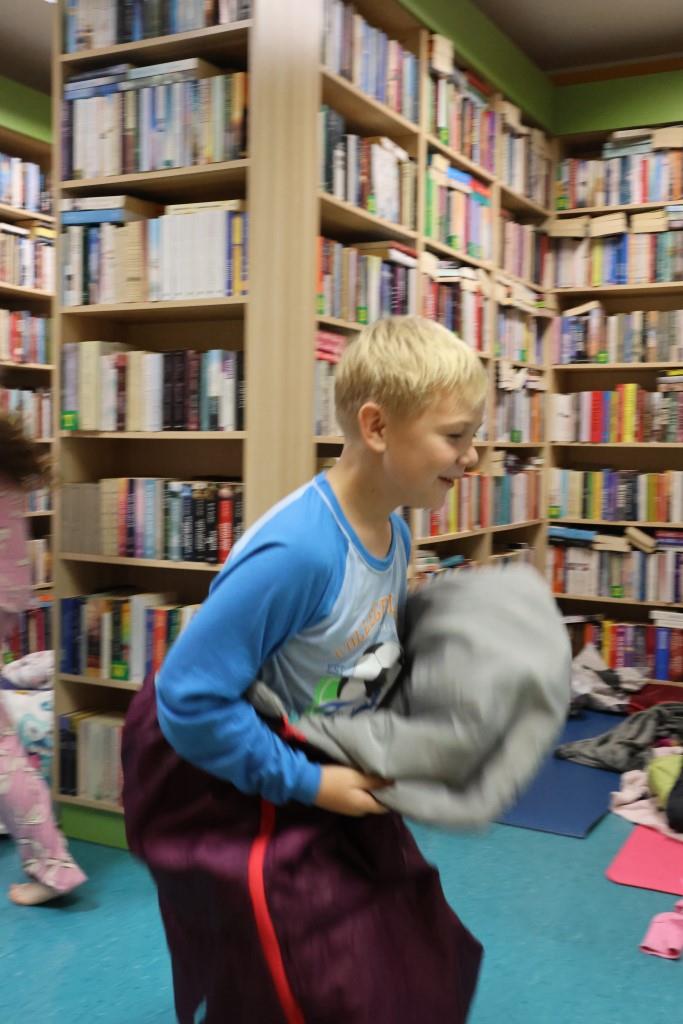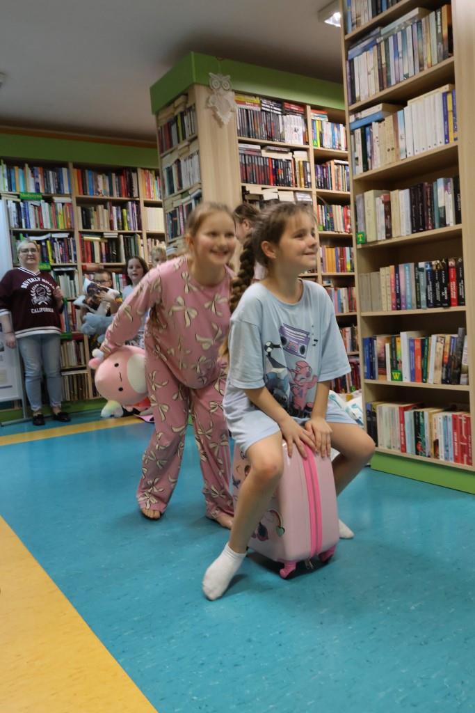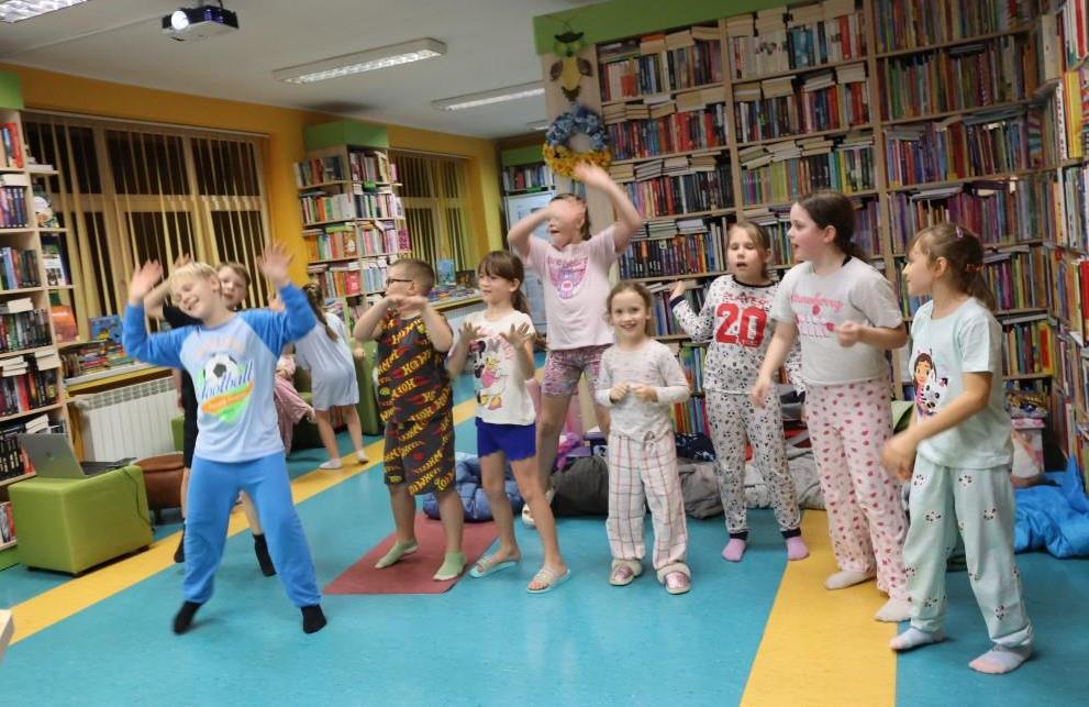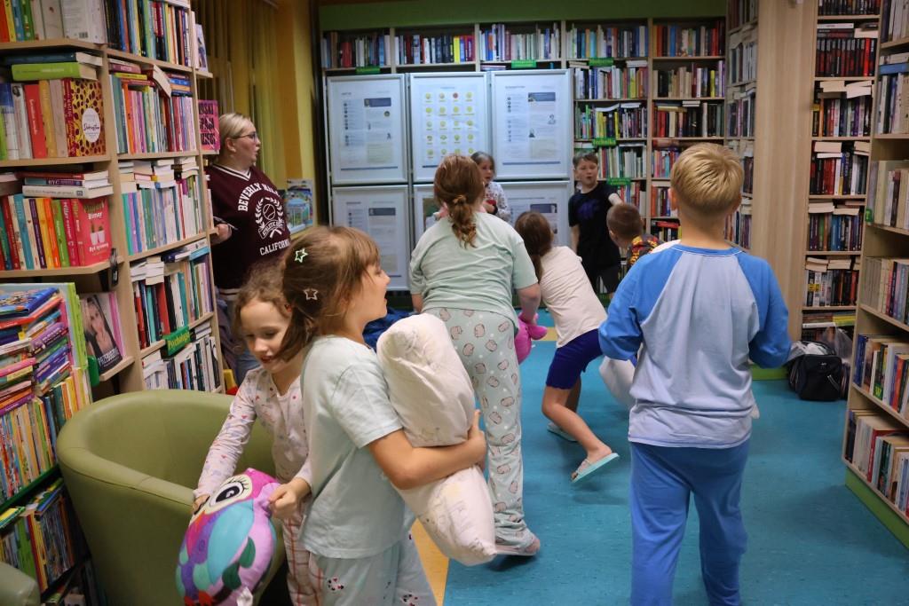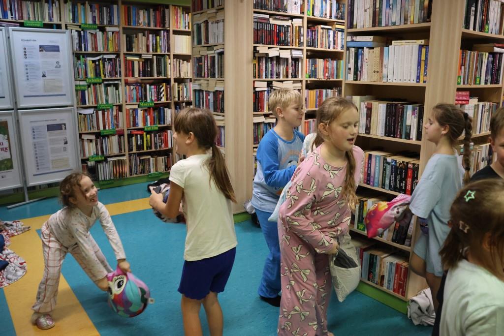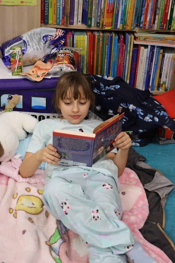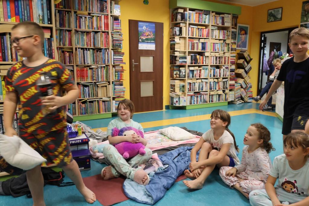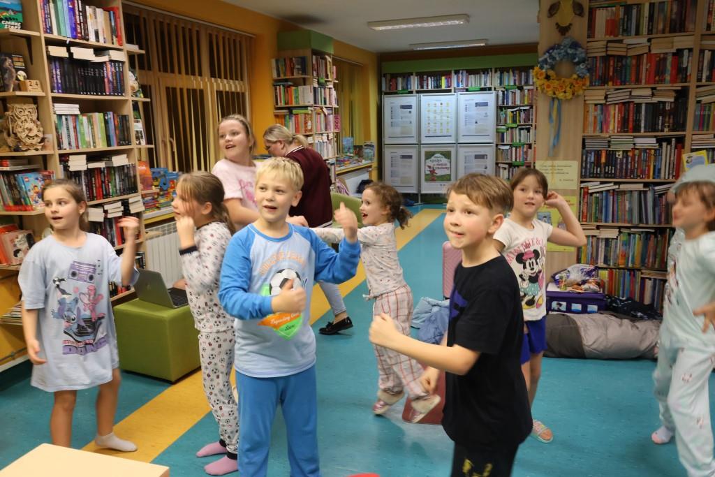 Była to również XI noc w blizanowskiej bibliotece, która od 2015r. organizowała dla umówionych grup uczniowskich po dwie noce w roku (w ferie i w czasie wyznaczonym przez Centrum Edukacji Obywatelskiej. Aktywną działalność na tym polu przerwała pandemia. Tym razem z 12-osobową grupą uczniów kl. IIIa Zespołu Szkolno-Przedszkolnego w Blizanowie nocowała ich wychowawczyni Ewelina Orpel, Gabi Oehl - uczennica kl. I SP nr 2 im. Jana Pawła II w Kaliszu oraz bibliotekarki GBP Blizanów: Paulina Wróblewska - dyrektor, Krystyna Gronowska i praktykantka Wiktoria Łyskawka. Spotkanie rozpoczęło się o godz. 18:30 i trwało do godz. 8:30 kolejnego dnia. Tym razem warsztaty klocków Lego przeprowadzone przez Klockowe studio konstrukcji były połączone z lekturą Harry’ego Pottera i nauką języka angielskiego. Odbyły się pod hasłem „Magic School – LEGO Wizards and Witches”. Na początku uczestnicy założyli Tiarę Przydziału, która wskazała im dom w magicznym uniwersum Harry’ego Pottera: Gryffindor, Hufflepuff, Ravenclaw lub Slytherin. Pracując w czterech grupach budowali: zamki, eliksiry, magiczne stworzenia i tajemnicze ogrody. Przy okazji poznawali angielskie słówka związane z magią. Nauka słownictwa połączona była z zabawą - grą memory. Na zakończenie każdy uczestnik otrzymał od prowadzących zajęcia dyplom oraz słodycze. O kulinaria tego wieczoru zadbały też mamy uczniów i praktykantka Wiktoria, przygotowując babeczki i deserki. Tradycją tej imprezy poza warsztatami kreatywnymi jest również wspólny posiłek (pizza-gigant), śpiewy, tańce i ... głośne czytanie. Dobór literatury był nieprzypadkowy „Lucek i Dziki Nieśpiki” Agnieszki Misiak. Tytułowe zwierzęta są metaforą stanu emocjonalnego dziecka. „Im bardziej trzeba iść spać, tym Lucka nachodzi większa ochota na zabawę, jedzenie czy wygłupy – nieokiełznane Dziki Nieśpiki szaleją w najlepsze”. Zupełnie jak w przypadku uczestników blizanowskiej nocy, którzy robili wszystko, by nie spać. Chociaż młodzi czytelnicy przynieśli śpiwory i ubrali się w piżamy, spania było naprawdę niewiele. W tym roku organizator akcji zaproponował bibliotekom projekcję filmu „Biuro Detektywistyczne Lassego i Mai. Rabuś z pociągu” - ekranizację kultowej serii książek dla dzieci autorstwa szwedzkiego pisarza Martina Widmarka. Podczas nocy w bibliotece można się było przekonać, że w jednym z pojazdów w bibliotece ukryty jest właśnie ten cykl książek.