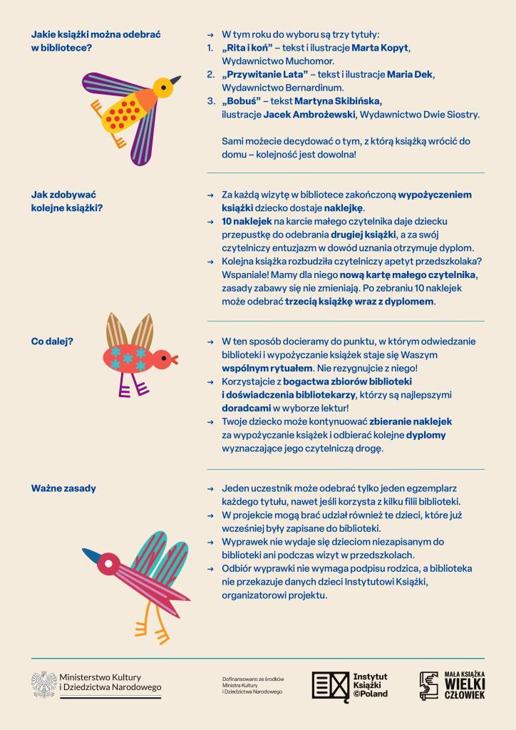 Książki wydajemy tylko dzieciom w wieku przedszkolnym, które zapiszą się lub są już zapisane i które wypożyczą co najmniej jedną książkę z działu dziecięcego. Przypominamy, że do zapisania się do biblioteki potrzebny jest bezwzględnie nr pesel. Obecność dorosłego opiekuna prawnego jest konieczna do otrzymania bezpłatnego pakietu. Ci, którzy jeszcze zbierają naklejki z poprzedniej edycji najpierw powinni ukończyć jeden projekt, aby wziąć udział w drugim. Są nowe Karty Małego Czytelnika i naklejki. Za każdą wizytę w bibliotece zakończoną wypożyczeniem minimum jednej książki z księgozbioru dziecięcego Mały Czytelnik otrzyma kolejną naklejkę, a po zebraniu dziesięciu zostanie uhonorowany imiennym dyplomem potwierdzającym jego czytelnicze zainteresowania. Oprócz dyplomu przedszkolak otrzyma także drobny czytelniczy upominek od Biblioteki.