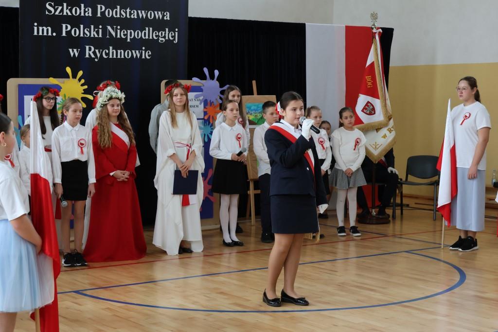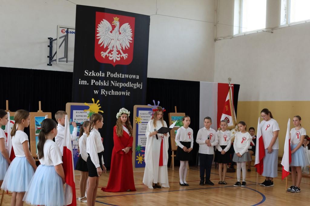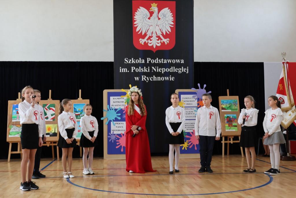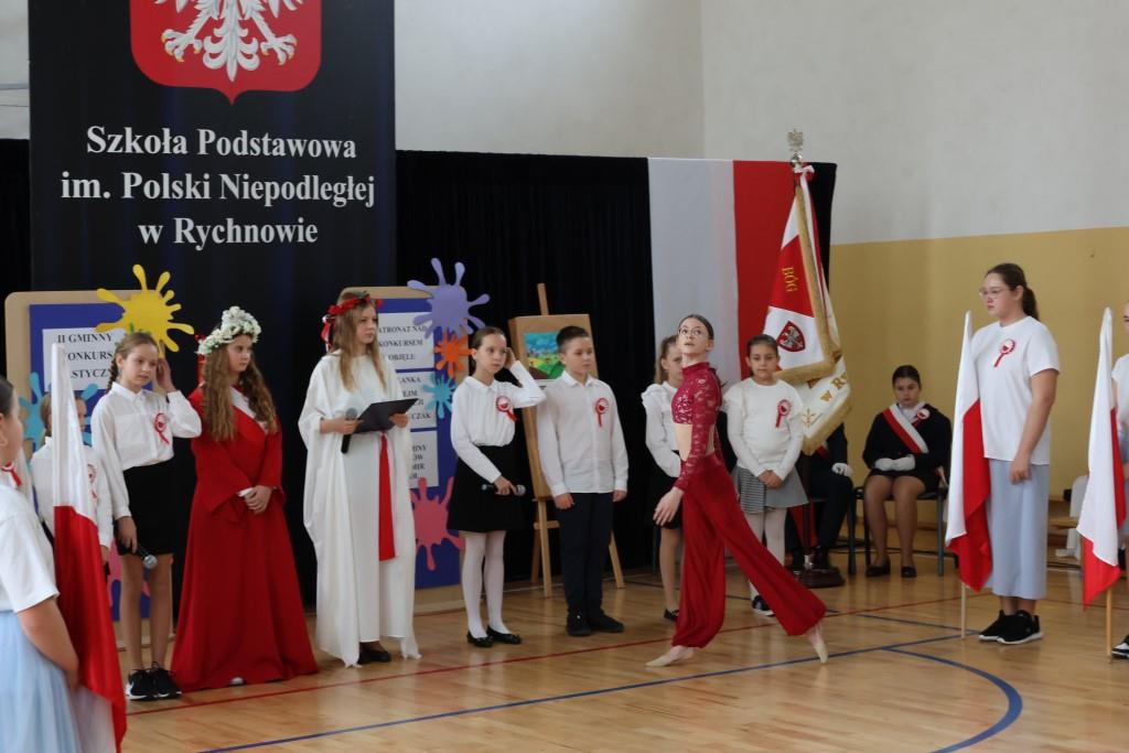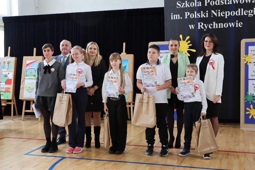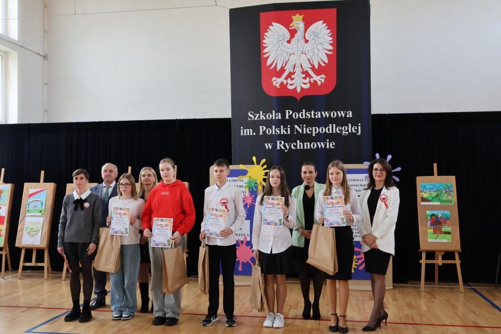 Szczególny charakter miały obchody rocznicy odzyskania niepodległości w Szkole Podstawowej w Rychnowie, która nosi imię Polski Niepodległej. Uroczystości rozpoczęła msza św. w kościele parafialnym w Rychnowie, którą odprawił ks. Maciej Borowicz - proboszcz parafii. Po niej uczestnicy przemaszerowali do szkoły na uroczystą akademię, którą przygotowały nauczycielki Katarzyna Marciniak i Renata Kościelak. Zaproszenie Zarządu Rychnowskiego Stowarzyszenia na Rzecz Dzieci i Młodzieży, który reprezentowały: Justyna Pietrzak – prezes i jednocześnie wicedyrektor szkoły, Katarzyna Marciniak – sekretarz, Natalia Kurek – członek zarządu oraz dyrektora szkoły – Krzysztofa Konewki przyjęli: Jolanta Raszewska – starszy wizytator kaliskiej delegatury Kuratorium Oświaty w Poznaniu, Joanna Włodarczyk – kierownik Ref. Oświaty UG Blizanów, Paulina Wróblewska – dyrektor Gminnej Biblioteki Publicznej w Blizanowie, Stanisław Niklas – dyrektor Gminnego Ośrodka Kultury w Blizanowie, Grzegorz Słodkowski – radny Rady Gminy Blizanów, Ewa Prus - członek honorowy stowarzyszenia, przedstawicielki Rady Rodziców: poza wyżej wymienioną Natalią Kurek - przewodniczącą, Sonia Kalinowska, Milena Konieczna. Podczas uroczystości wyniki II Gminnego Konkursu Plastycznego pod hasłem „Piękna Nasza Niepodległa” ogłosiła nauczyciel i plastyk Anna Olczyk – przewodnicząca jury. Poza nią 35 prac oceniały też: Anna Janowiak-Markiewicz – artysta plastyk, ikonopis i Małgorzata Kraszkiewicz – nauczyciel konsultant ds. edukacji przedszkolnej i wczesnoszkolnej ODN w Kaliszu. W tym roku uczestnicy przyjechali do rychnowskiej szkoły 30 października i wykonywali prace na miejscu. Miały się w nich pojawić symbole narodowe.