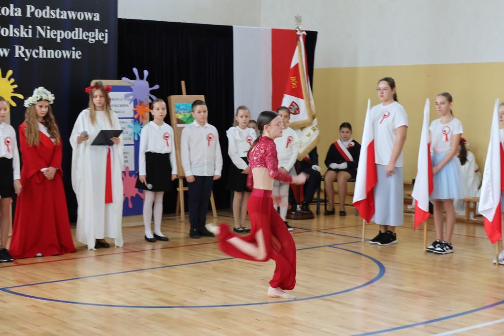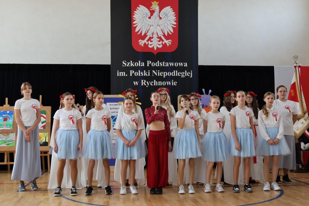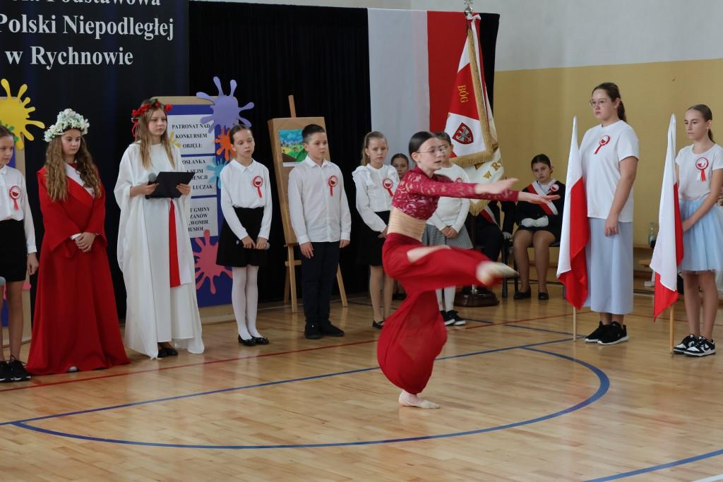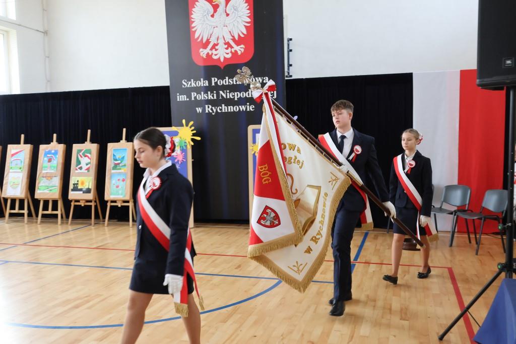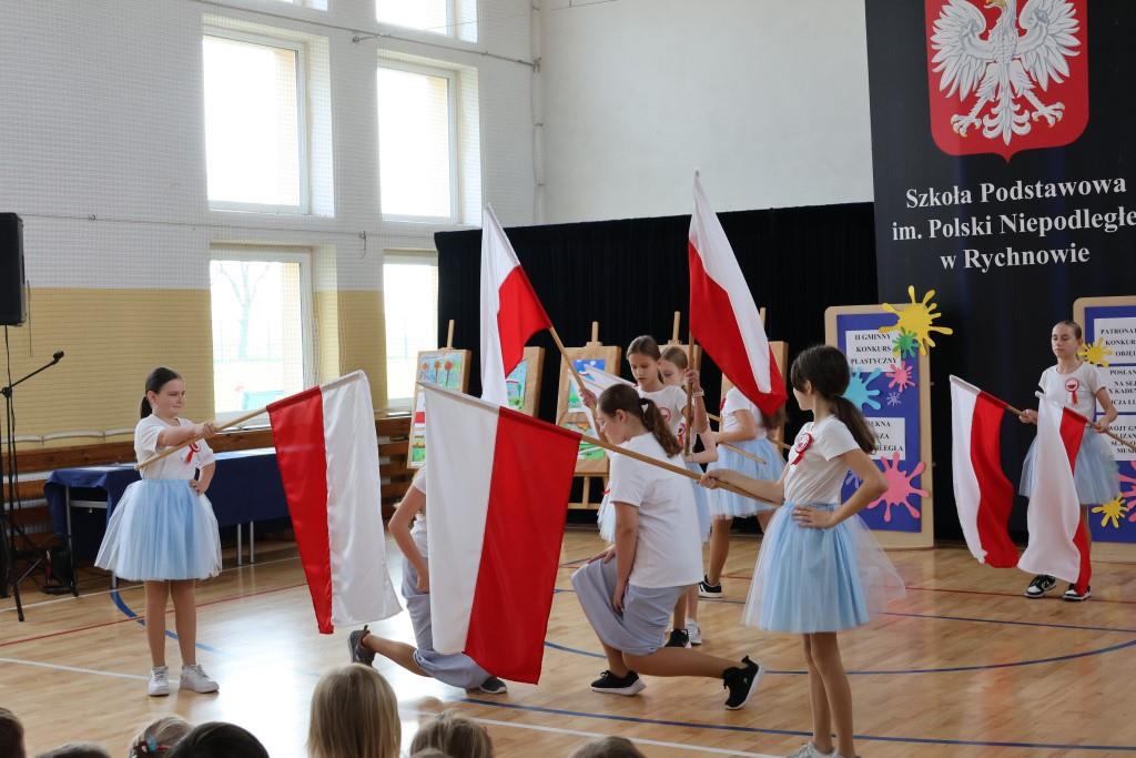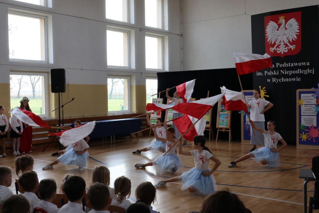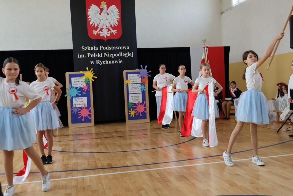 Szczególny charakter miały obchody rocznicy odzyskania niepodległości w Szkole Podstawowej w Rychnowie, która nosi imię Polski Niepodległej. Uroczystości rozpoczęła msza św. w kościele parafialnym w Rychnowie, którą odprawił ks. Maciej Borowicz - proboszcz parafii. Po niej uczestnicy przemaszerowali do szkoły na uroczystą akademię, którą przygotowały nauczycielki Katarzyna Marciniak i Renata Kościelak. Zaproszenie Zarządu Rychnowskiego Stowarzyszenia na Rzecz Dzieci i Młodzieży, który reprezentowały: Justyna Pietrzak – prezes i jednocześnie wicedyrektor szkoły, Katarzyna Marciniak – sekretarz, Natalia Kurek – członek zarządu oraz dyrektora szkoły – Krzysztofa Konewki przyjęli: Jolanta Raszewska – starszy wizytator kaliskiej delegatury Kuratorium Oświaty w Poznaniu, Joanna Włodarczyk – kierownik Ref. Oświaty UG Blizanów, Paulina Wróblewska – dyrektor Gminnej Biblioteki Publicznej w Blizanowie, Stanisław Niklas – dyrektor Gminnego Ośrodka Kultury w Blizanowie, Grzegorz Słodkowski – radny Rady Gminy Blizanów, Ewa Prus - członek honorowy stowarzyszenia, przedstawicielki Rady Rodziców: poza wyżej wymienioną Natalią Kurek - przewodniczącą, Sonia Kalinowska, Milena Konieczna. Podczas uroczystości wyniki II Gminnego Konkursu Plastycznego pod hasłem „Piękna Nasza Niepodległa” ogłosiła nauczyciel i plastyk Anna Olczyk – przewodnicząca jury. Poza nią 35 prac oceniały też: Anna Janowiak-Markiewicz – artysta plastyk, ikonopis i Małgorzata Kraszkiewicz – nauczyciel konsultant ds. edukacji przedszkolnej i wczesnoszkolnej ODN w Kaliszu. W tym roku uczestnicy przyjechali do rychnowskiej szkoły 30 października i wykonywali prace na miejscu. Miały się w nich pojawić symbole narodowe.
