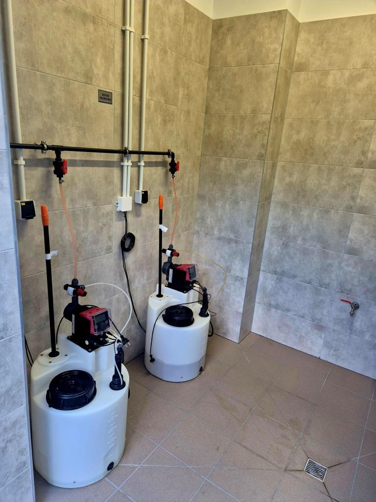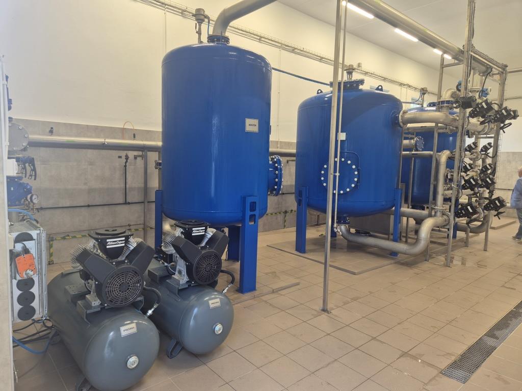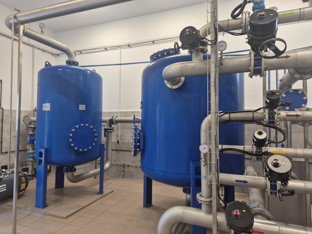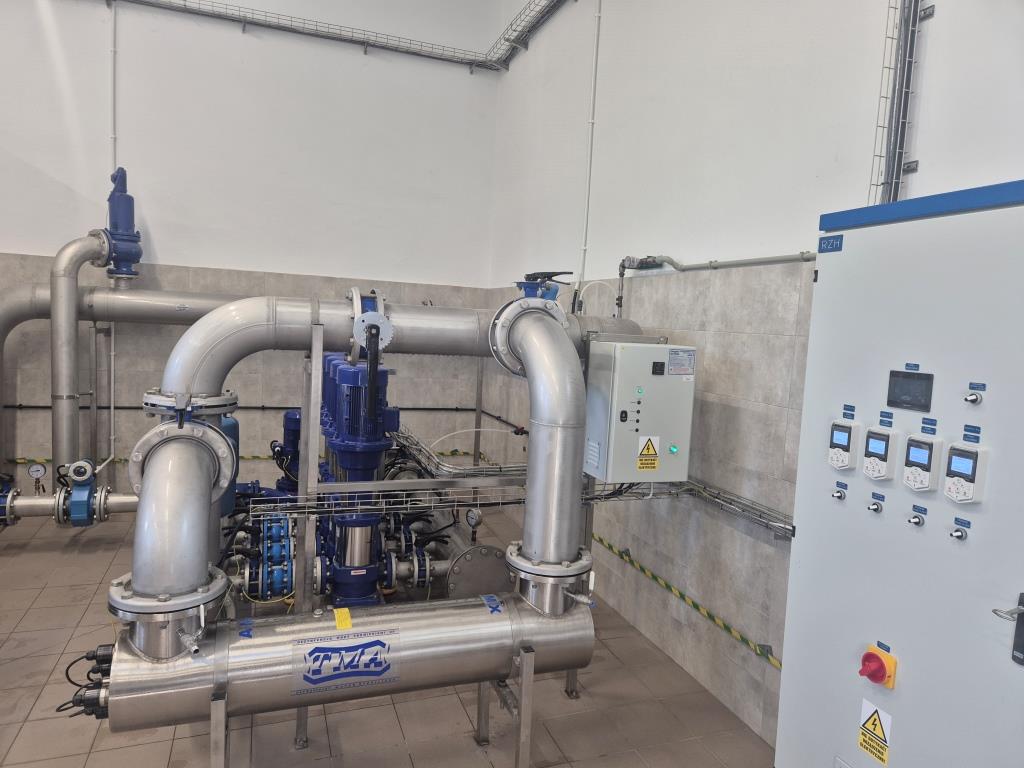 - montaż nowoczesnego układu technologicznego uzdatniania wody, obejmującego filtry ciśnieniowe zamknięte oraz zestaw hydroforowy dla pompowni II stopnia o wydajności 200 m³/h, wraz z rurociągiem wody uzdatnionej DN 250,
