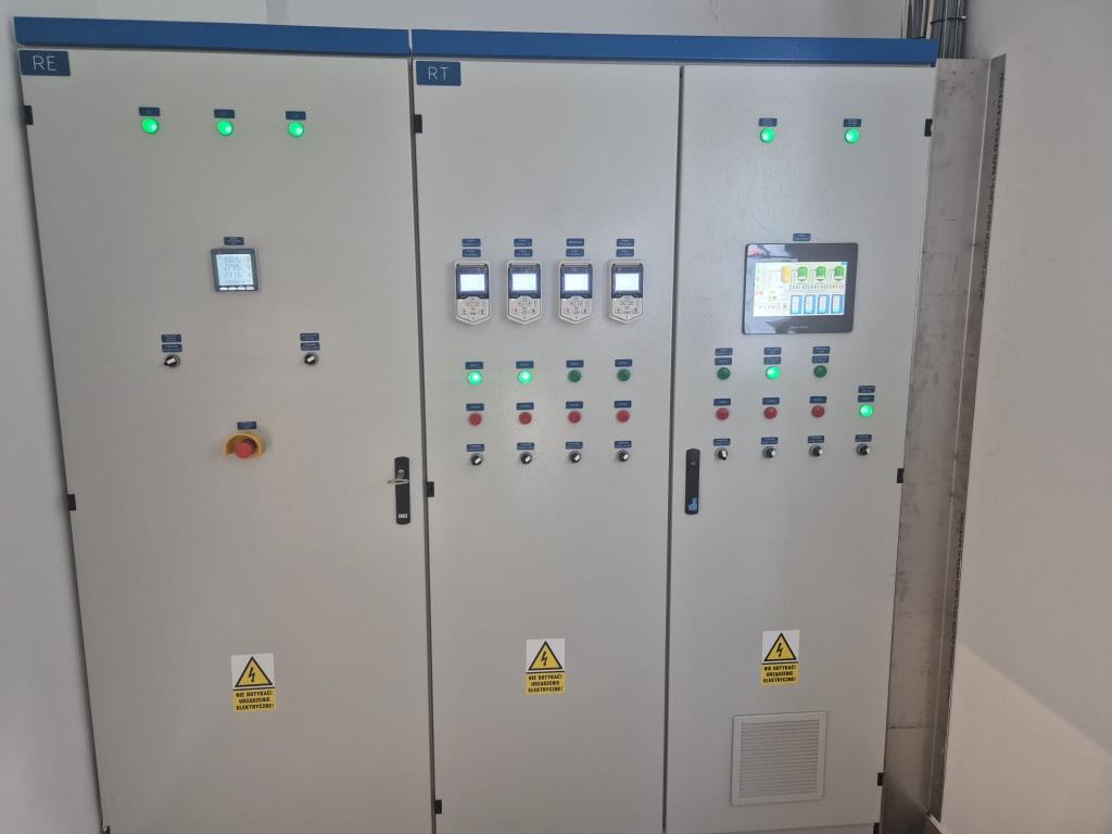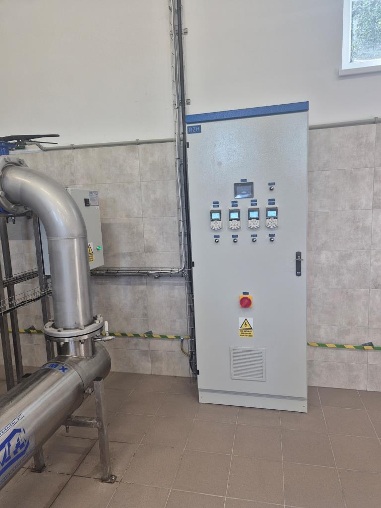 - instalację pełnej automatyki i systemu sterowania procesem uzdatniania wody (w tym płukania filtrów, kontroli ilości wody pobieranej ze studni oraz podawanej do sieci publicznej),