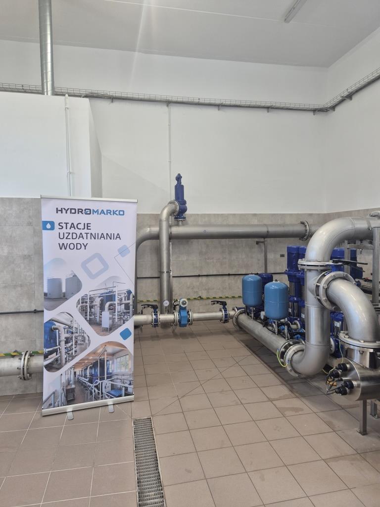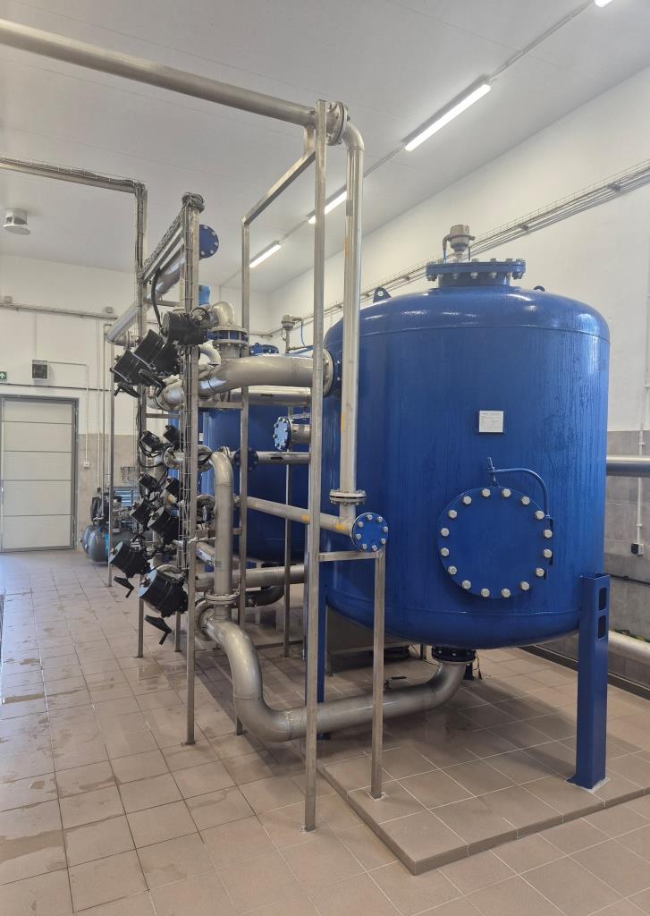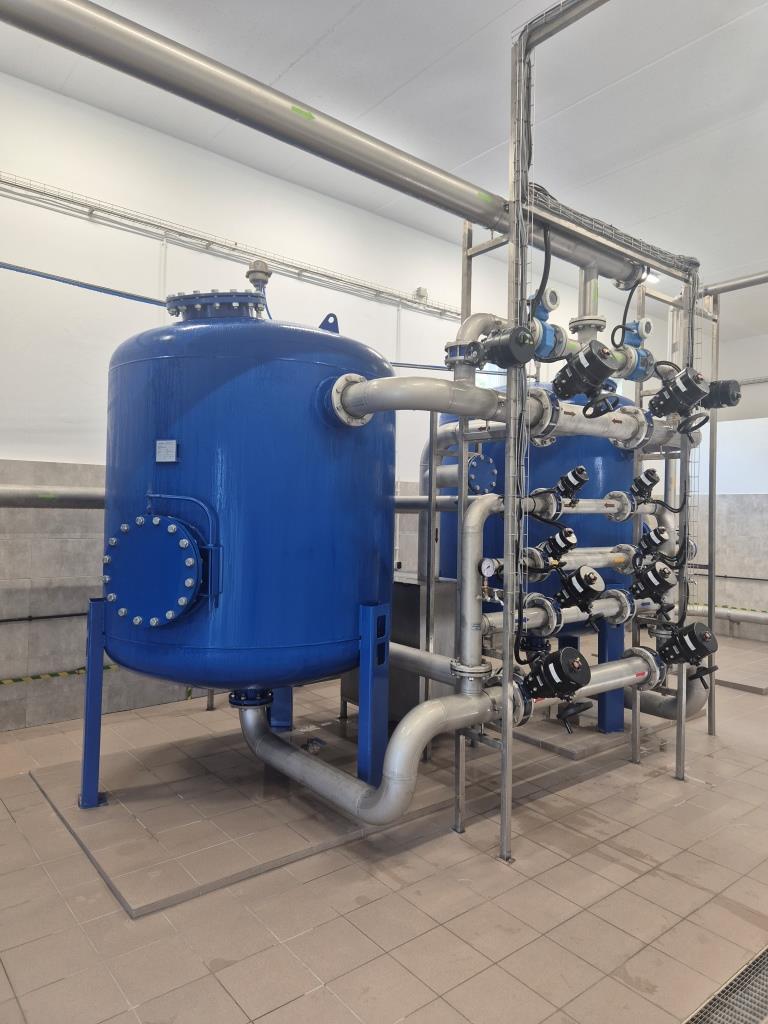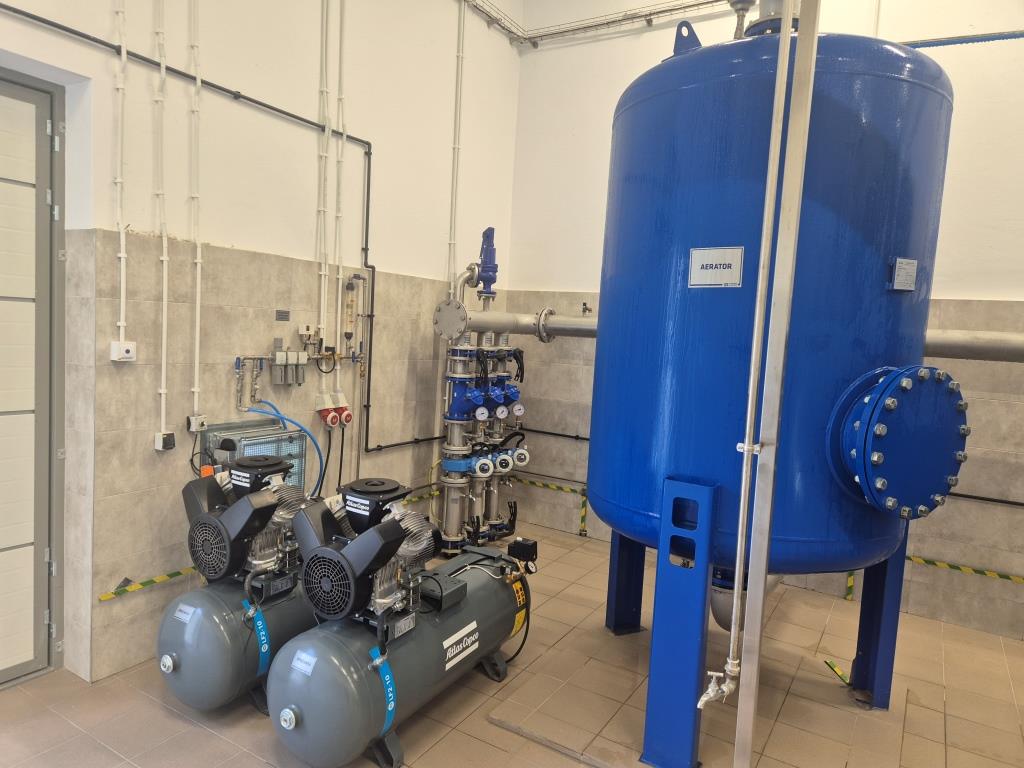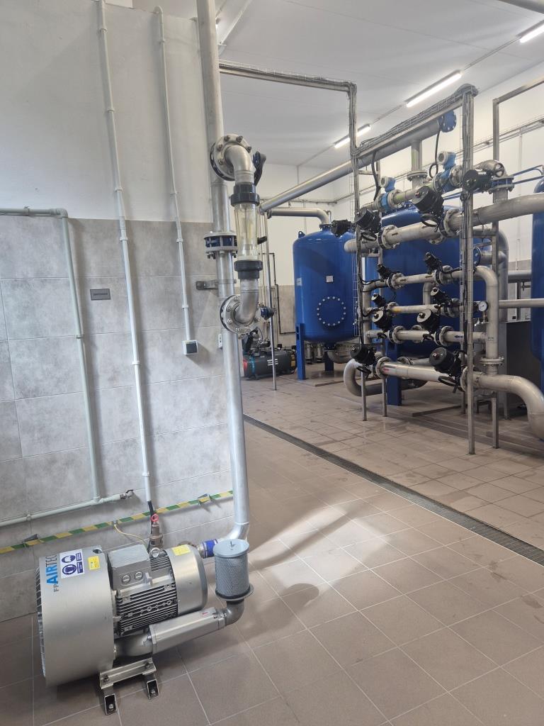 - montaż nowoczesnego układu technologicznego uzdatniania wody, obejmującego filtry ciśnieniowe zamknięte oraz zestaw hydroforowy dla pompowni II stopnia o wydajności 200 m³/h, wraz z rurociągiem wody uzdatnionej DN 250,