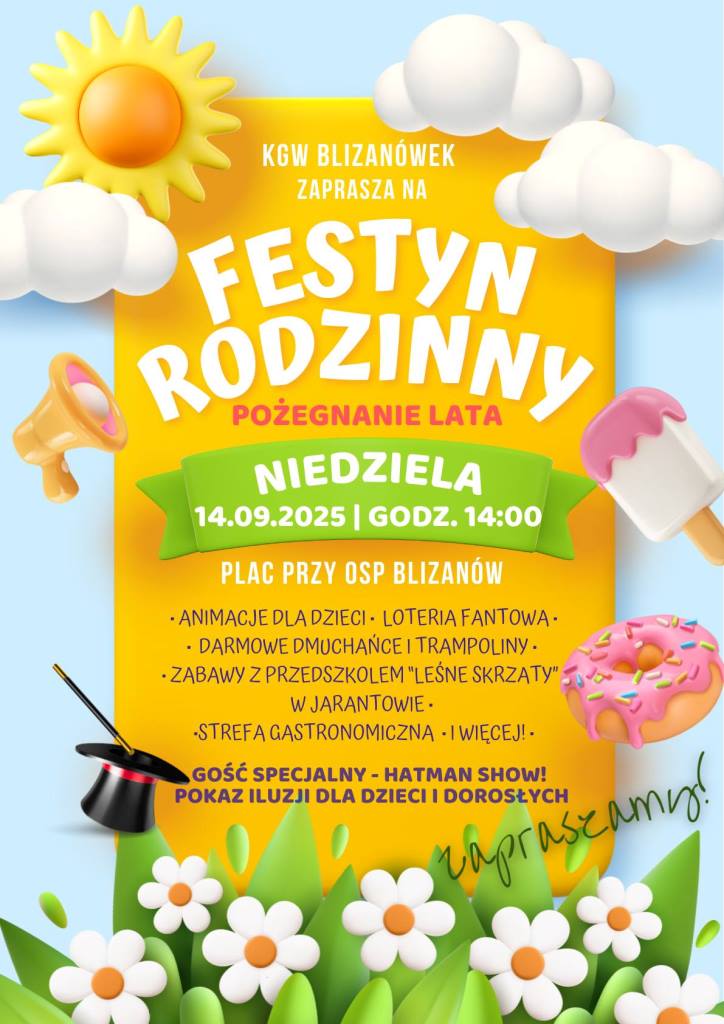 Piąty rok z rzędu KGW Blizanówek zorganizowało Festyn rodzinny na pożegnanie lata. Na placu przy OSP Blizanów były: stoiska gastronomiczne, dmuchańce, trampolina, animacje dla dzieci z „Figle Migle”, pokaz samochodów strażackich. Swoje stoisko miało Przedszkole „Leśne Skrzaty” w Jarantowie. Atrakcją specjalną był pokaz iluzji Hatman Show. Poza Dj-em czas umilała kapela „Wędrowcy znad Prosny”. W loterii można było wygrać m.in.: hulajnogę elektryczną, rower, samochód na weekend, vouchery na usługi.