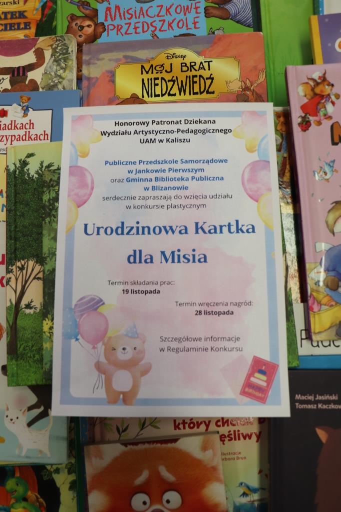 Gminna Biblioteka Publiczna w Blizanowie i Publiczne Przedszkole Samorządowe w Jankowie Pierwszym zachęcają dzieci w wieku 3-6 lat, uczęszczające do przedszkoli na terenie gminy Blizanów do udziału w konkursie plastycznym „Urodzinowa Kartka dla Misia”. Prace z metryczką na odwrocie i zgodą rodziców należy dostarczyć do GBP w Blizanowie do 19 listopada.