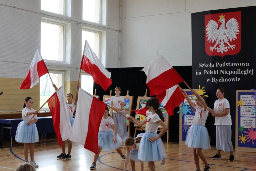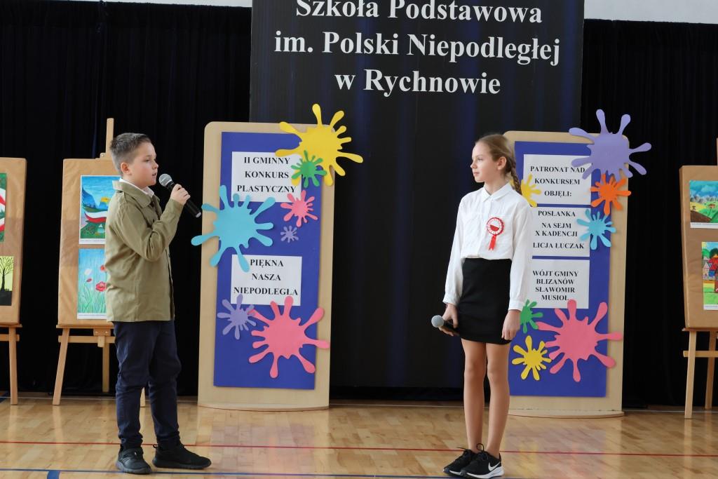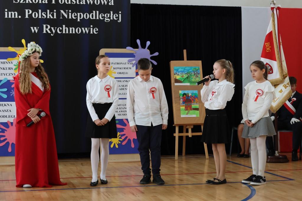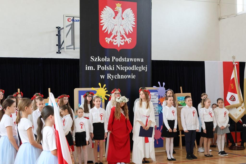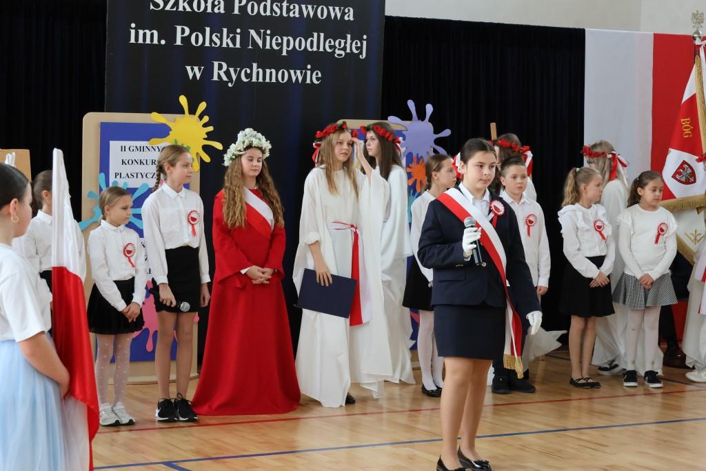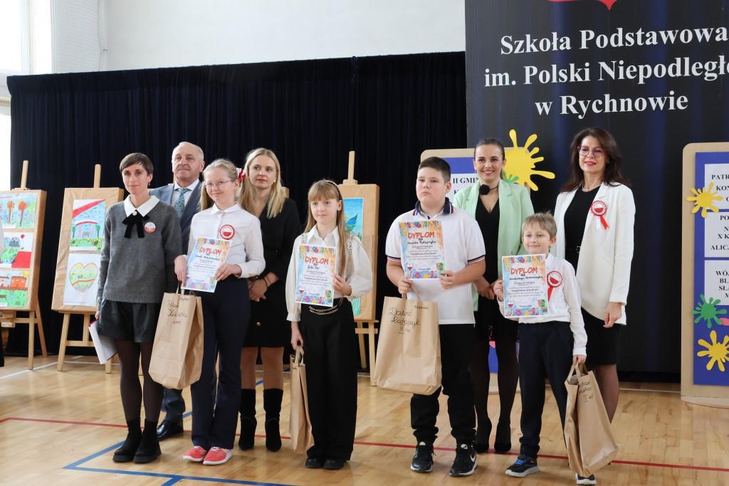 Szczególny charakter miały obchody rocznicy odzyskania niepodległości w Szkole Podstawowej w Rychnowie, która nosi imię Polski Niepodległej. Uroczystości rozpoczęła msza św. w kościele parafialnym w Rychnowie, którą odprawił ks. Maciej Borowicz - proboszcz parafii. Po niej uczestnicy przemaszerowali do szkoły na uroczystą akademię, którą przygotowały nauczycielki Katarzyna Marciniak i Renata Kościelak. Zaproszenie Zarządu Rychnowskiego Stowarzyszenia na Rzecz Dzieci i Młodzieży, który reprezentowały: Justyna Pietrzak – prezes i jednocześnie wicedyrektor szkoły, Katarzyna Marciniak – sekretarz, Natalia Kurek – członek zarządu oraz dyrektora szkoły – Krzysztofa Konewki przyjęli: Jolanta Raszewska – starszy wizytator kaliskiej delegatury Kuratorium Oświaty w Poznaniu, Joanna Włodarczyk – kierownik Ref. Oświaty UG Blizanów, Paulina Wróblewska – dyrektor Gminnej Biblioteki Publicznej w Blizanowie, Stanisław Niklas – dyrektor Gminnego Ośrodka Kultury w Blizanowie, Grzegorz Słodkowski – radny Rady Gminy Blizanów, Ewa Prus - członek honorowy stowarzyszenia, przedstawicielki Rady Rodziców: poza wyżej wymienioną Natalią Kurek - przewodniczącą, Sonia Kalinowska, Milena Konieczna. Podczas uroczystości wyniki II Gminnego Konkursu Plastycznego pod hasłem „Piękna Nasza Niepodległa” ogłosiła nauczyciel i plastyk Anna Olczyk – przewodnicząca jury. Poza nią 35 prac oceniały też: Anna Janowiak-Markiewicz – artysta plastyk, ikonopis i Małgorzata Kraszkiewicz – nauczyciel konsultant ds. edukacji przedszkolnej i wczesnoszkolnej ODN w Kaliszu. W tym roku uczestnicy przyjechali do rychnowskiej szkoły 30 października i wykonywali prace na miejscu. Miały się w nich pojawić symbole narodowe.