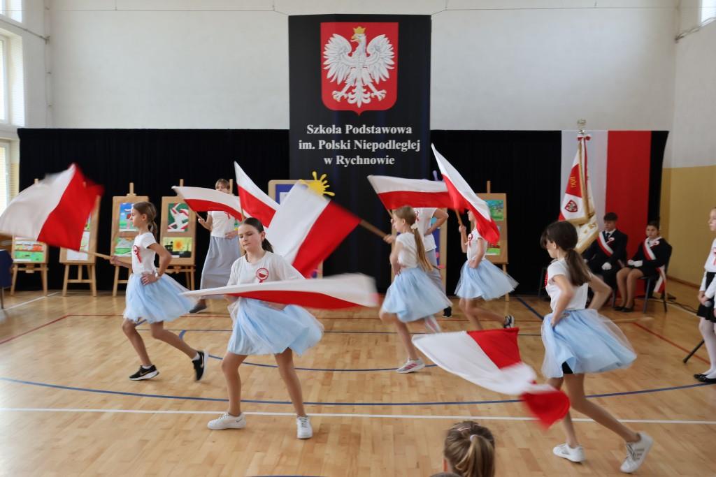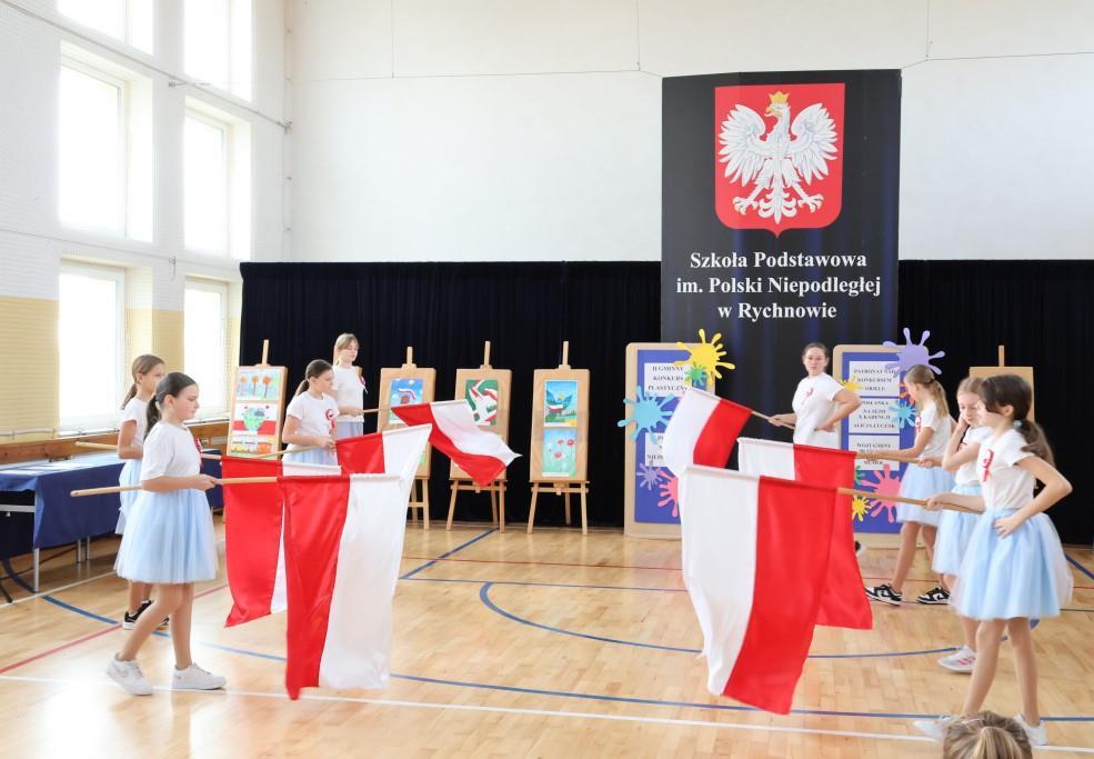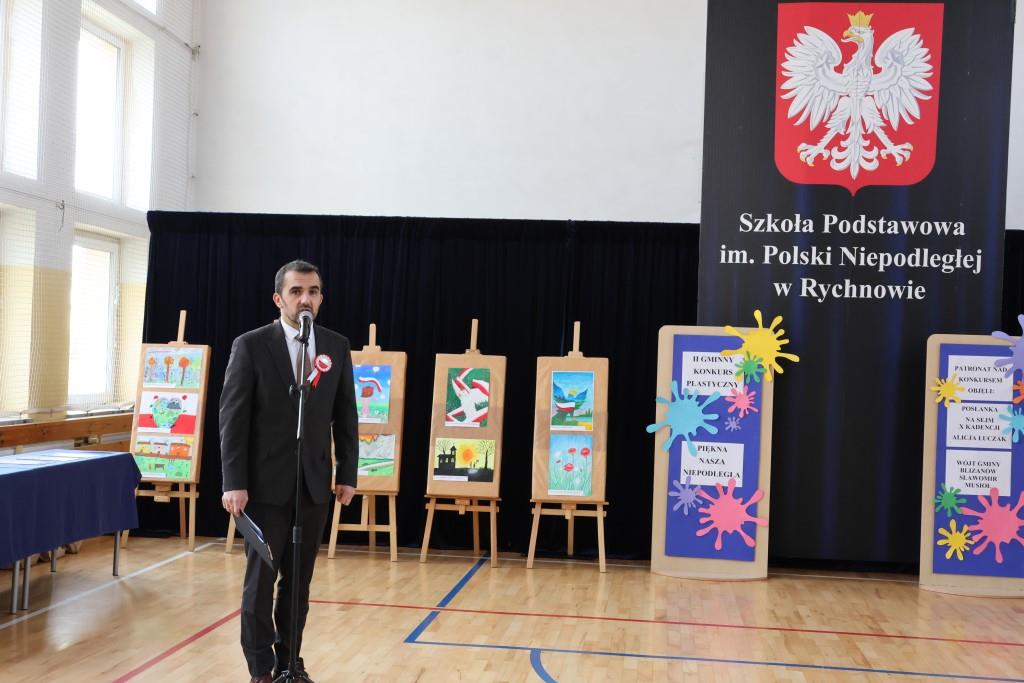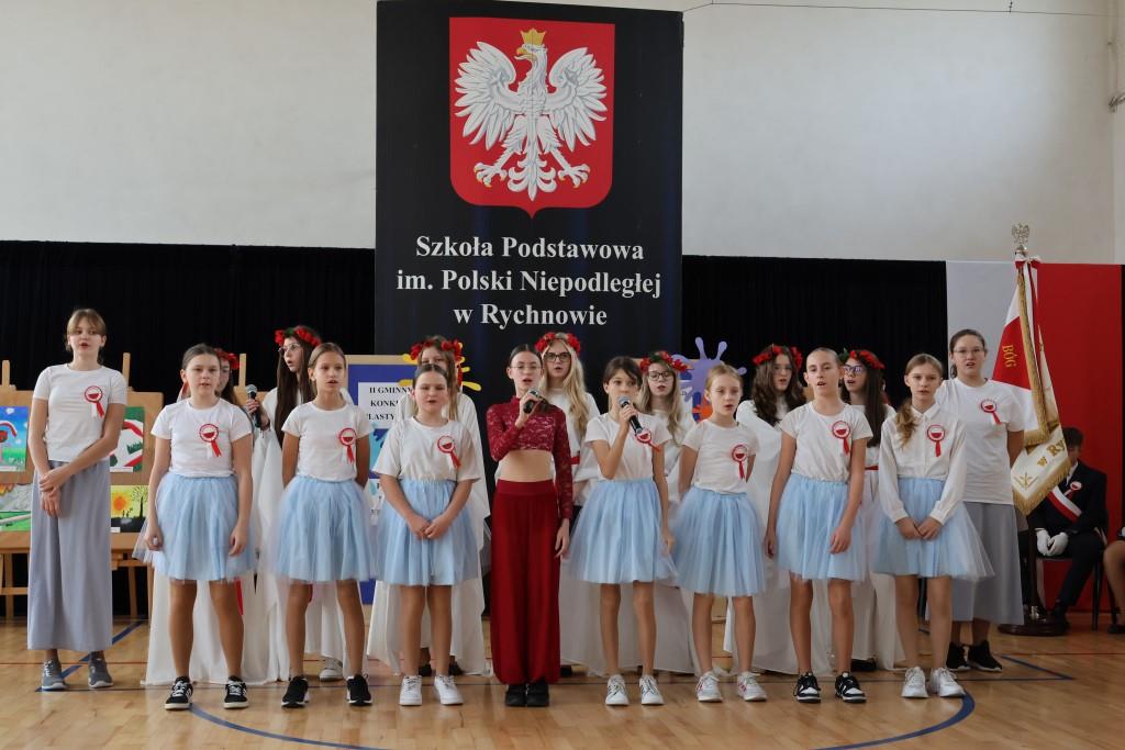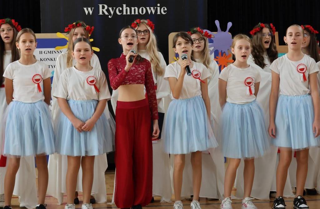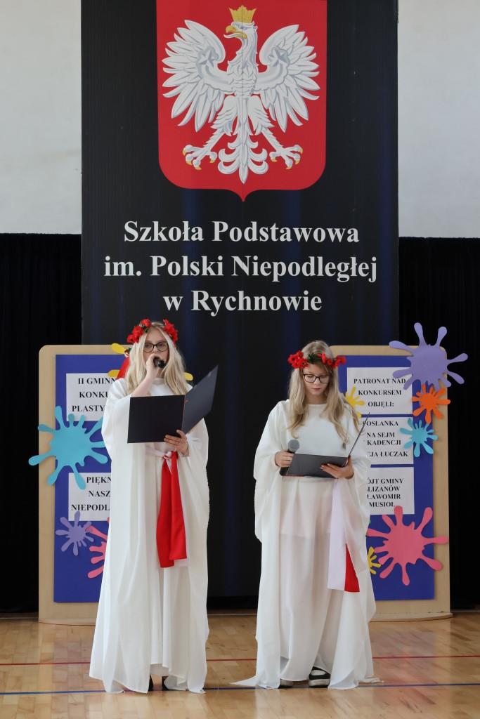 Szczególny charakter miały obchody rocznicy odzyskania niepodległości w Szkole Podstawowej w Rychnowie, która nosi imię Polski Niepodległej. Uroczystości rozpoczęła msza św. w kościele parafialnym w Rychnowie, którą odprawił ks. Maciej Borowicz - proboszcz parafii. Po niej uczestnicy przemaszerowali do szkoły na uroczystą akademię, którą przygotowały nauczycielki Katarzyna Marciniak i Renata Kościelak. Zaproszenie Zarządu Rychnowskiego Stowarzyszenia na Rzecz Dzieci i Młodzieży, który reprezentowały: Justyna Pietrzak – prezes i jednocześnie wicedyrektor szkoły, Katarzyna Marciniak – sekretarz, Natalia Kurek – członek zarządu oraz dyrektora szkoły – Krzysztofa Konewki przyjęli: Jolanta Raszewska – starszy wizytator kaliskiej delegatury Kuratorium Oświaty w Poznaniu, Joanna Włodarczyk – kierownik Ref. Oświaty UG Blizanów, Paulina Wróblewska – dyrektor Gminnej Biblioteki Publicznej w Blizanowie, Stanisław Niklas – dyrektor Gminnego Ośrodka Kultury w Blizanowie, Grzegorz Słodkowski – radny Rady Gminy Blizanów, Ewa Prus - członek honorowy stowarzyszenia, przedstawicielki Rady Rodziców: poza wyżej wymienioną Natalią Kurek - przewodniczącą, Sonia Kalinowska, Milena Konieczna. Podczas uroczystości wyniki II Gminnego Konkursu Plastycznego pod hasłem „Piękna Nasza Niepodległa” ogłosiła nauczyciel i plastyk Anna Olczyk – przewodnicząca jury. Poza nią 35 prac oceniały też: Anna Janowiak-Markiewicz – artysta plastyk, ikonopis i Małgorzata Kraszkiewicz – nauczyciel konsultant ds. edukacji przedszkolnej i wczesnoszkolnej ODN w Kaliszu. W tym roku uczestnicy przyjechali do rychnowskiej szkoły 30 października i wykonywali prace na miejscu. Miały się w nich pojawić symbole narodowe.