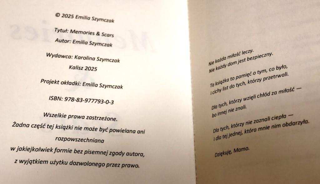 „Zamknęłam tu gniew, ból i nadzieję, by przypomnieć, że nawet złamane serce może kochać i tworzyć” – napisała na tylnej okładce młoda autorka, mieszkająca w Brudzewie. Jej wiersze poruszają tematykę toksycznych relacji romantycznych i rodzinnych oraz blizn po trudnych doświadczeniach. Na tle bolesnych wspomnień wyróżnia się wątek matczynej miłości, pełen czułości, spokoju i nadziei. Mama Karolina została wydawcą, ze względu na procedurę rejestracji ISBN, do której potrzebna jest osoba dorosła, a Emilka zostanie nią za parę miesięcy. Siedemnastolatka samodzielnie pracowała nad okładką i zawartością tomiku. Już teraz ma pomysł na kolejny tomik, nie wyklucza też, że wyda coś pisanego prozą. Poza mamą wiele zawdzięcza swojej nauczycielce od filozofii z Zespołu Szkół Technicznych i Ogólnokształcących we Wrześni, która w pracach pisemnych doceniała jej dojrzałość i wrażliwość oraz motywowała ją do rozwijania talentu pisarskiego. Najbliższą okazję do zapoznania się z jej twórczością będą mieli seniorzy sołectwa Brudzew.