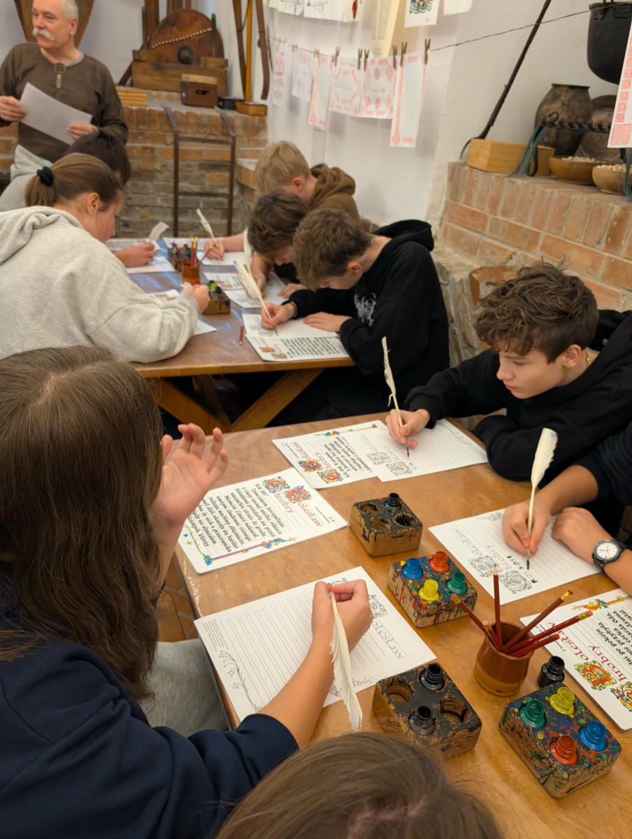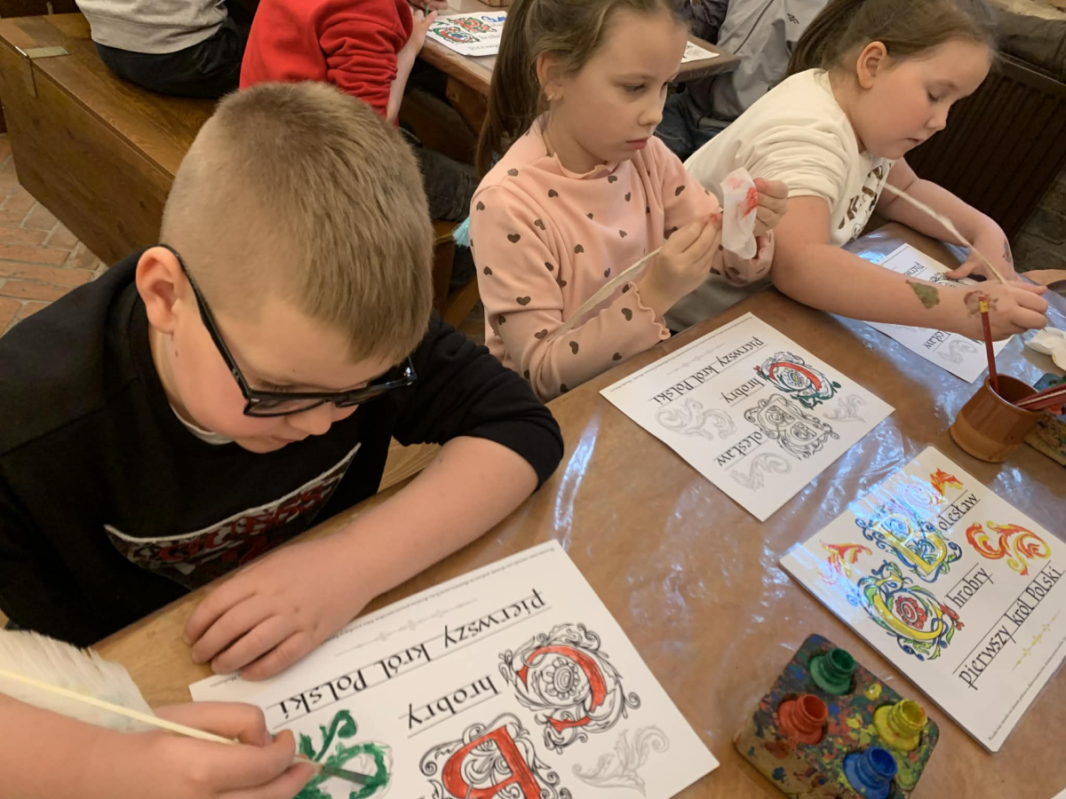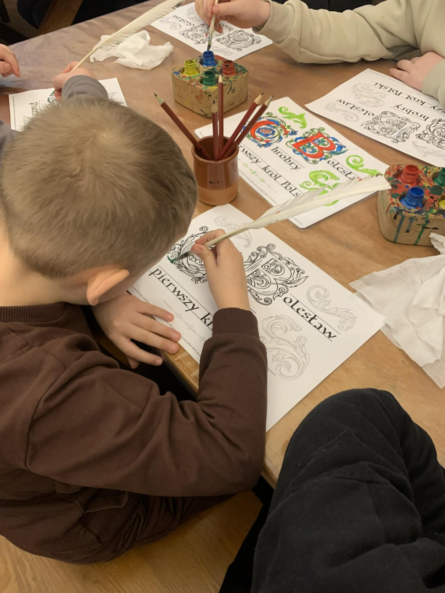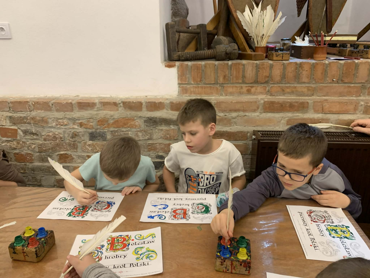 Podczas pobytu w Kaliszu uczniowie wzięli udział w interaktywnych warsztatach poświęconych postaci Bolesława Chrobrego. W średniowiecznym skryptorium poznawali tajniki dawnej sztuki pisarskiej – pisali gęsim piórem, wykonywali iluminowane inicjały oraz odkrywali tradycje średniowiecznego piśmiennictwa.