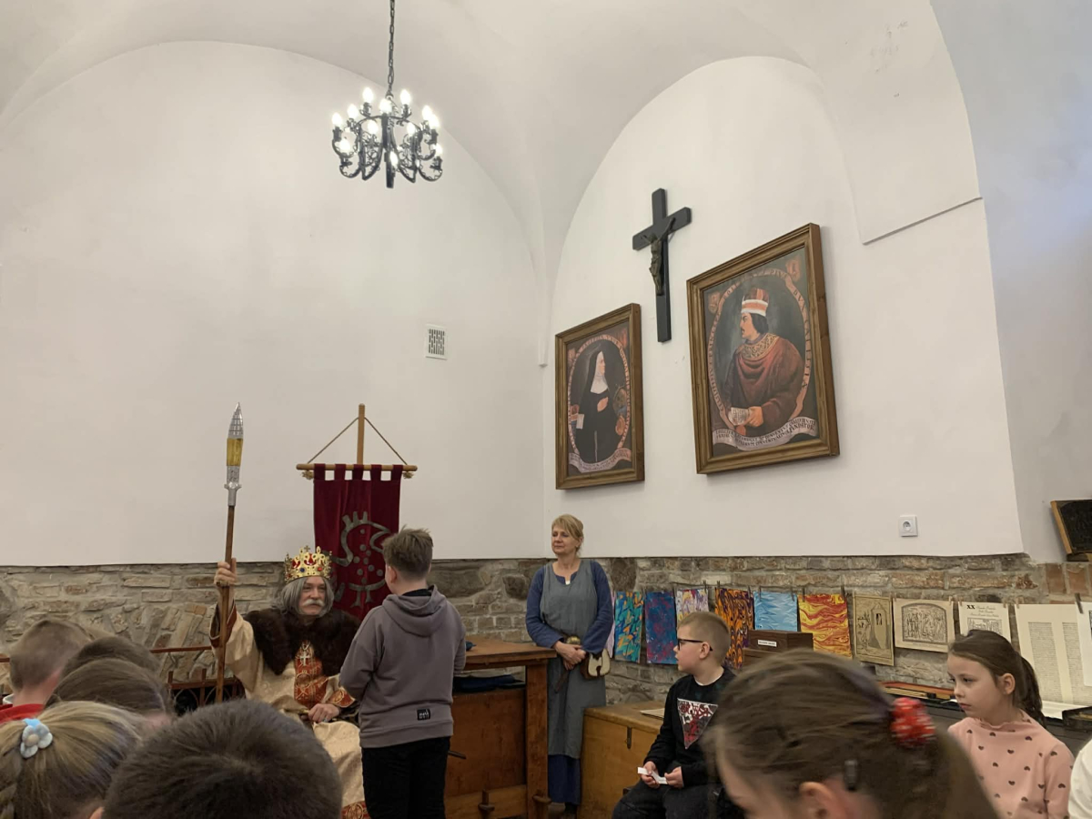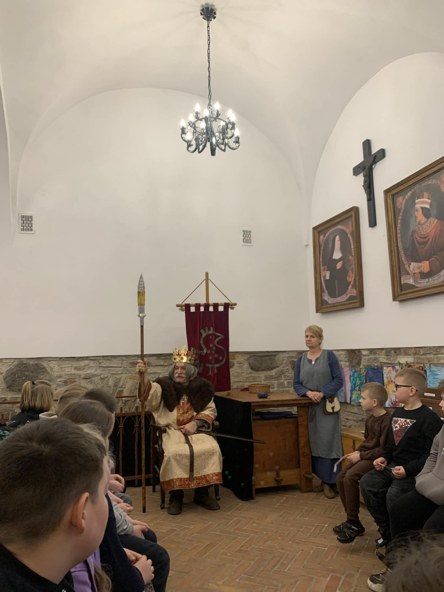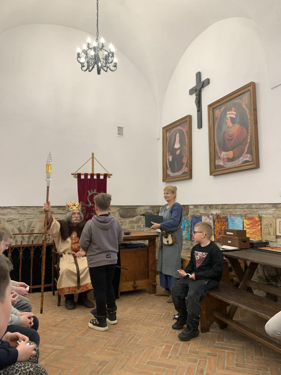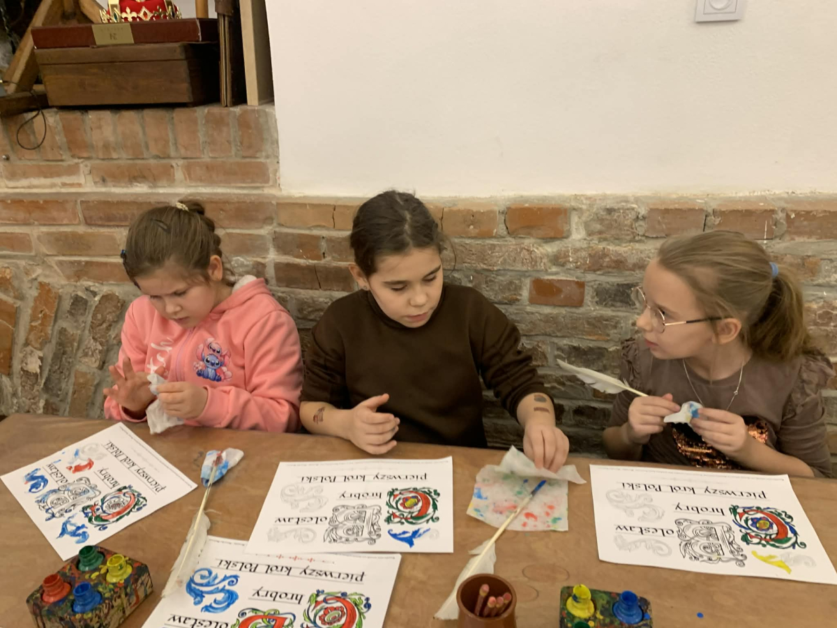 Podczas pobytu w Kaliszu uczniowie wzięli udział w interaktywnych warsztatach poświęconych postaci Bolesława Chrobrego. W średniowiecznym skryptorium poznawali tajniki dawnej sztuki pisarskiej – pisali gęsim piórem, wykonywali iluminowane inicjały oraz odkrywali tradycje średniowiecznego piśmiennictwa.